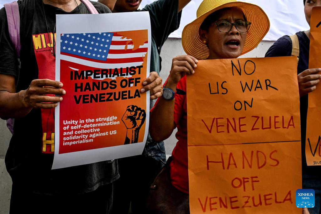 People holding placards protest against the U.S. military strike against Venezuela, outside the U.S. Embassy in Jakarta, Indonesia, Jan. 6, 2026. (Photo by Agung Kuncahya B./Xinhua)