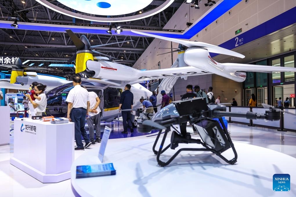 Visitors learn about drone exhibits at the 4th Global Digital Trade Expo in Hangzhou, east China's Zhejiang Province, Sept. 25, 2025. (Xinhua/Jiang Han)