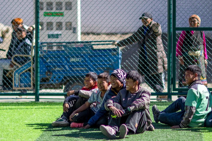 Teenagers watch their friends play football at a football field in Zimgag Village of Chamco Township, in Dingri County of Xigaze City, southwest China's Xizang Autonomous Region, on Jan. 5, 2026. (Xinhua/Jiang Fan)