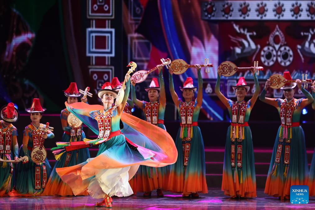 Actresses of a dance troupe of Gansu's Zhangye City perform a dance during the first show of a mass cultural performance and broadcasting event held at the Lanzhou Concert Hall in Lanzhou, northwest China's Gansu Province, on Jan. 7, 2026. The mass cultural performance and broadcasting event, which plans to organize 240 mass cultural shows throughout the year, aims to build cultural and artistic stages for the general public at their doorsteps. (Xinhua/Chen Bin)