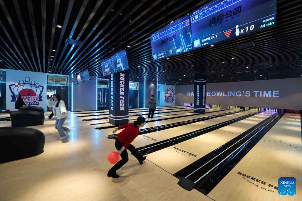 People play bowling at the Rucker Park, a comprehensive sports park, in Jindong District of Jinhua City, east China's Zhejiang Province, on Jan. 8, 2026. In recent years, Jindong District of Jinhua City has developed the cultural and tourism industry by leveraging its cultural, sports and music resources, creating new consumption scenarios for tourism with distinctive features, including sports parks, camping bases, old rural streets and ceramic art galleries. (Xinhua/Xu Yu)