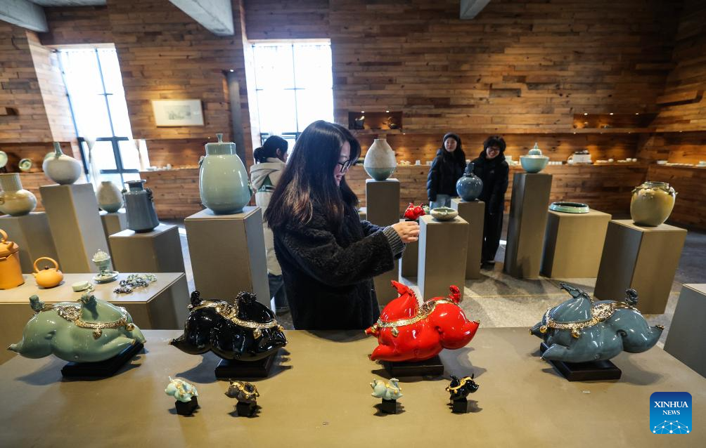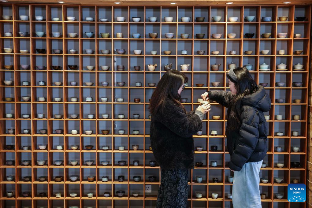 People visit a museum of ancient Wuzhou kiln pottery in Jindong District of Jinhua City, east China's Zhejiang Province, on Jan. 8, 2026. In recent years, Jindong District of Jinhua City has developed the cultural and tourism industry by leveraging its cultural, sports and music resources, creating new consumption scenarios for tourism with distinctive features, including sports parks, camping bases, old rural streets and ceramic art galleries. (Xinhua/Xu Yu)