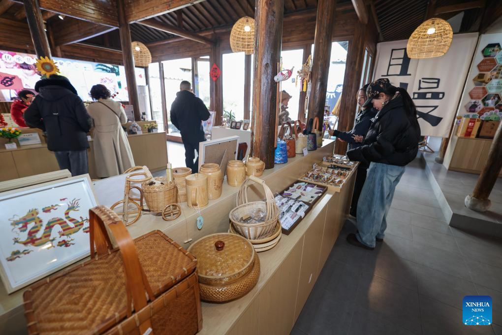 People shop at a traditional handicraft store in Poyang ancient street in Jindong District of Jinhua City, east China's Zhejiang Province, on Jan. 8, 2026. In recent years, Jindong District of Jinhua City has developed the cultural and tourism industry by leveraging its cultural, sports and music resources, creating new consumption scenarios for tourism with distinctive features, including sports parks, camping bases, old rural streets and ceramic art galleries. (Xinhua/Xu Yu)
