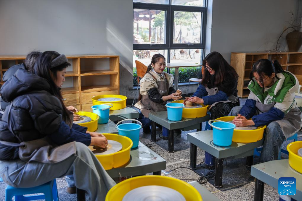 Tourists experience pottery making at a museum of ancient Wuzhou kiln pottery in Jindong District of Jinhua City, east China's Zhejiang Province, on Jan. 8, 2026. In recent years, Jindong District of Jinhua City has developed the cultural and tourism industry by leveraging its cultural, sports and music resources, creating new consumption scenarios for tourism with distinctive features, including sports parks, camping bases, old rural streets and ceramic art galleries. (Xinhua/Xu Yu)