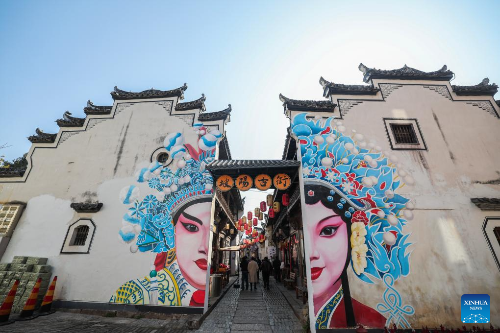 This photo taken on Jan. 8, 2026 shows a view of the renovated Poyang ancient street in Jindong District of Jinhua City, east China's Zhejiang Province. In recent years, Jindong District of Jinhua City has developed the cultural and tourism industry by leveraging its cultural, sports and music resources, creating new consumption scenarios for tourism with distinctive features, including sports parks, camping bases, old rural streets and ceramic art galleries. (Xinhua/Xu Yu)