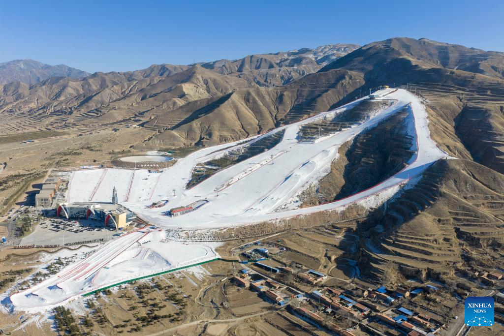 An aerial drone photo taken on Jan. 8, 2026 shows a panoramic view of the Guangwu international ski resort in Shanyin County of Shuozhou, north China's Shanxi Province. Shanyin County has been leveraging its geographical advantage to develop ice and snow-themed tourism, which is now a new driver for the local economy. (Xinhua/Yang Chenguang)