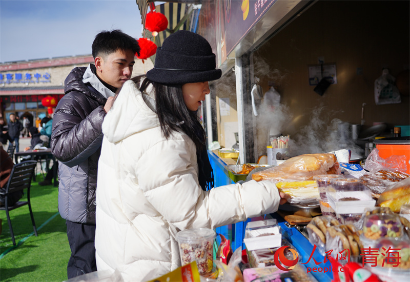 Tourists browse a food stall at Mt. Gangshika scenic area in Menyuan Hui Autonomous County, Haibei Tibetan Autonomous Prefecture, northwest China's Qinghai Province. (People's Daily Online/Gan Haiqiong)
