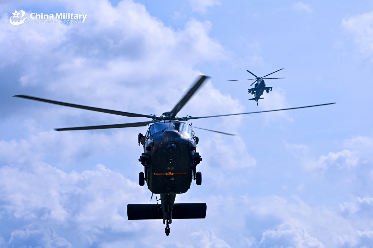 A Z-20 utility helicopter attached to a brigade under the Chinese PLA 73rd Group Army hovers over the target area under the cover of a Z-10 attack helicopter during a flight training exercise in mid-December, 2025. (eng.chinamil.com.cn/Photo by Zhou Zelai)