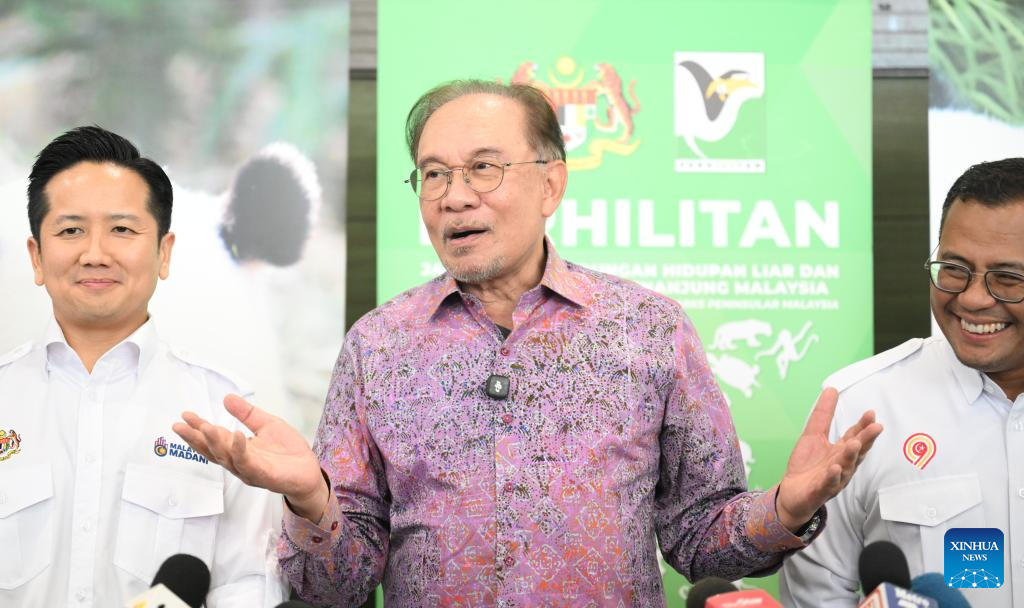 Malaysian Prime Minister Anwar Ibrahim speaks to the media at Zoo Negara in Selangor, Malaysia, on Jan. 10, 2026. China's giant pandas "Chenxing" and "Xiaoyue," currently on loan to Malaysia, officially met the public here on Saturday. (Xinhua/Cheng Yiheng)