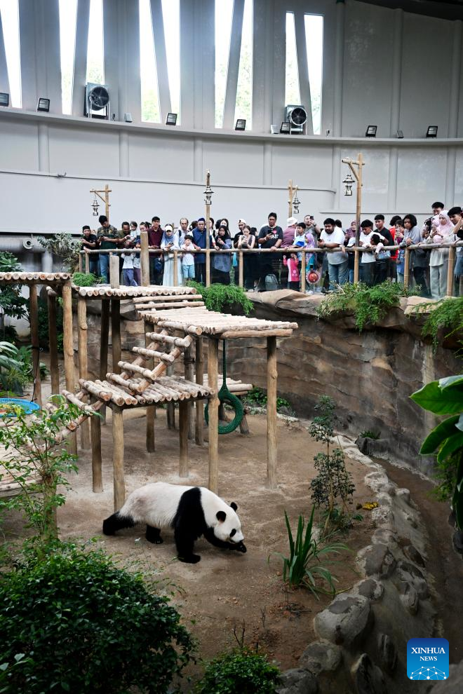 People view giant panda "Chenxing" at Zoo Negara in Selangor, Malaysia, on Jan. 10, 2026. China's giant pandas "Chenxing" and "Xiaoyue," currently on loan to Malaysia, officially met the public here on Saturday. (Xinhua/Cheng Yiheng)