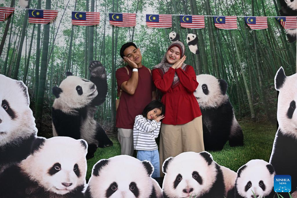 A family poses for photos with panda-themed decorations at Zoo Negara in Selangor, Malaysia, on Jan. 10, 2026. China's giant pandas "Chenxing" and "Xiaoyue," currently on loan to Malaysia, officially met the public here on Saturday. (Xinhua/Cheng Yiheng)