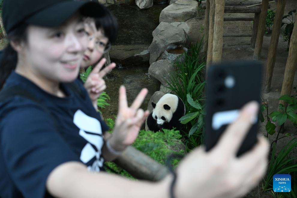People pose for selfies with giant panda "Xiaoyue" at Zoo Negara in Selangor, Malaysia, on Jan. 10, 2026. China's giant pandas "Chenxing" and "Xiaoyue," currently on loan to Malaysia, officially met the public here on Saturday. (Xinhua/Cheng Yiheng)