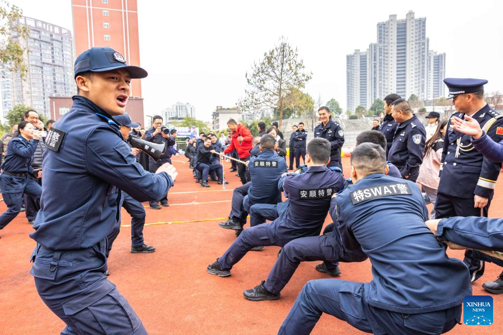 Police officers participate in a tug-of-war contest at Anshun public security bureau in Anshun City, southwest China's Guizhou Province, Jan. 10, 2026. Various activities were held nationwide to mark the sixth Chinese People's Police Day. (Photo by Chen Xi/Xinhua)