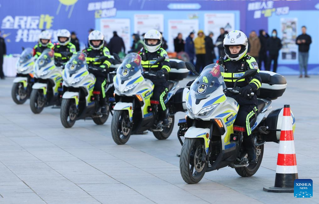 Police officers demonstrate motorcycle riding skills in Shijiazhuang, north China's Hebei Province, Jan. 10, 2026. Various activities were held nationwide to mark the sixth Chinese People's Police Day. (Photo by Liang Zidong/Xinhua)