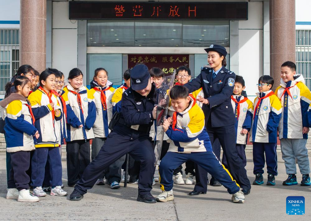 A police officer introduces police equipment to children at a border inspection station in Huai'an, east China's Jiangsu Province, Jan. 10, 2026. Various activities were held nationwide to mark the sixth Chinese People's Police Day. (Photo by Yin Chao/Xinhua)