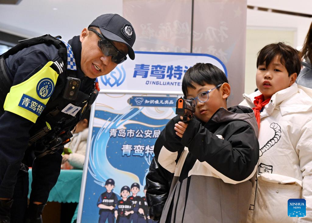 A police officer introduces police equipment to citizens in Qingdao, east China's Shandong Province, Jan. 10, 2026. Various activities were held nationwide to mark the sixth Chinese People's Police Day. (Xinhua/Li Ziheng)