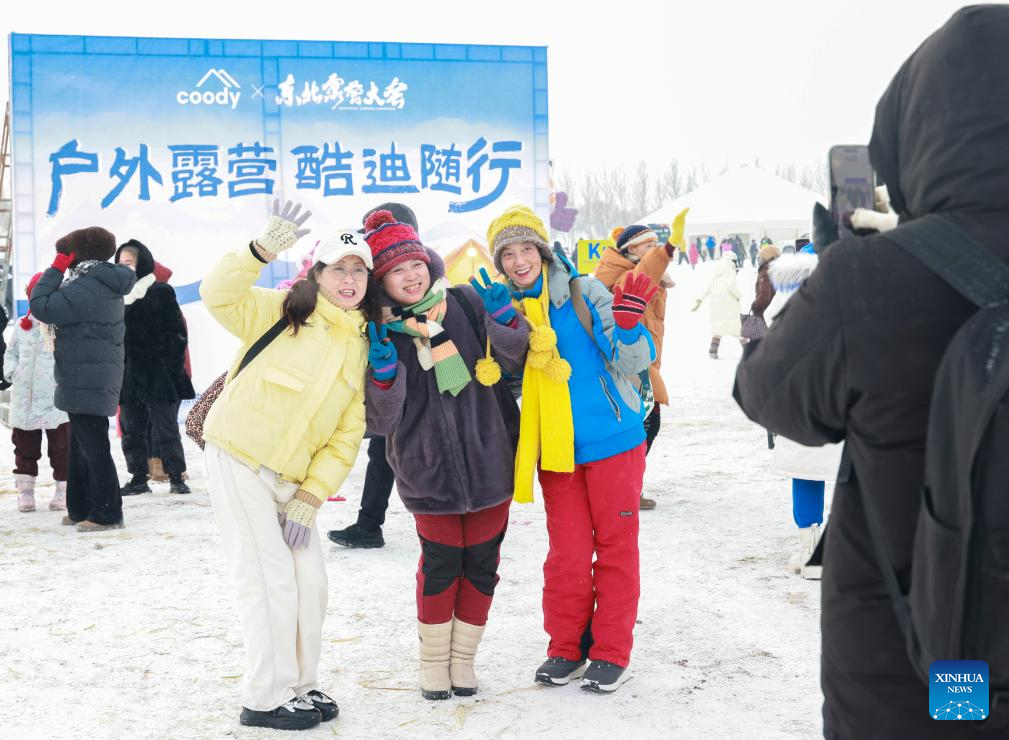 Tourists pose for photos at a camping festival in Qiqihar City, northeast China's Heilongjiang Province, on Jan. 12, 2026. The week-long camping festival opened here on Monday, where camping enthusiasts and tourists across China are allowed to experience the unique charm of camping and local folk customs in frigid chilliness. (Photo by Xu Shuai/Xinhua)