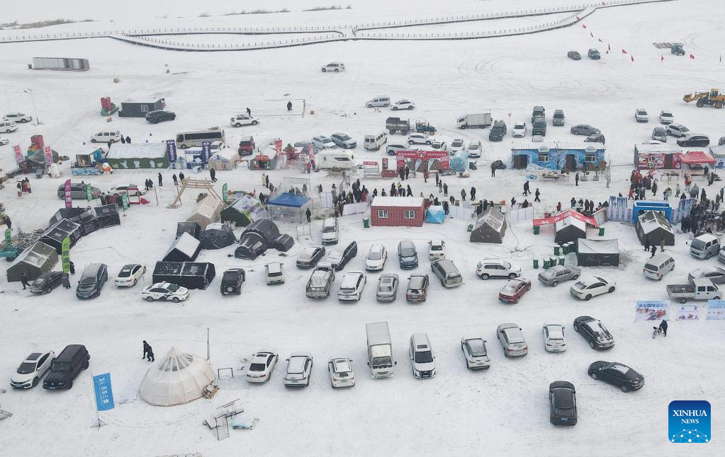 An aerial drone photo taken on Jan. 12, 2026 shows tourists visiting a village fair during a camping festival in Qiqihar City, northeast China's Heilongjiang Province. The week-long camping festival opened here on Monday, where camping enthusiasts and tourists across China are allowed to experience the unique charm of camping and local folk customs in frigid chilliness. (Photo by Li Nan/Xinhua)