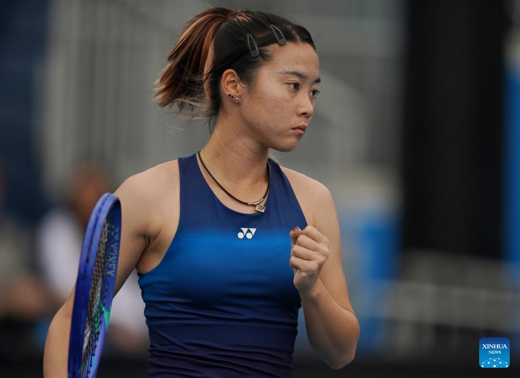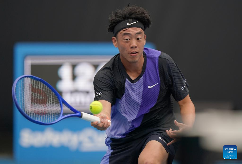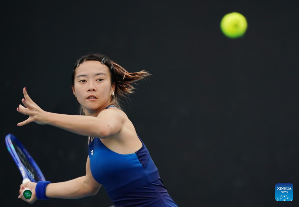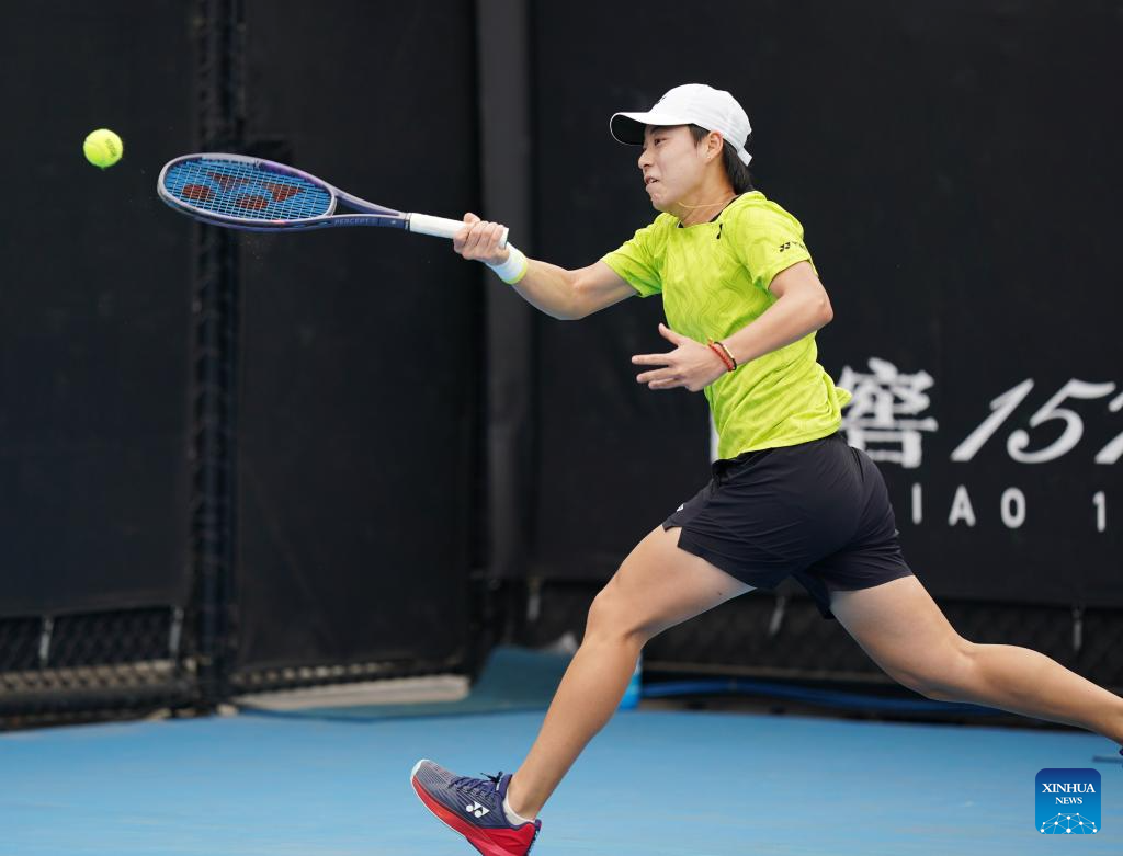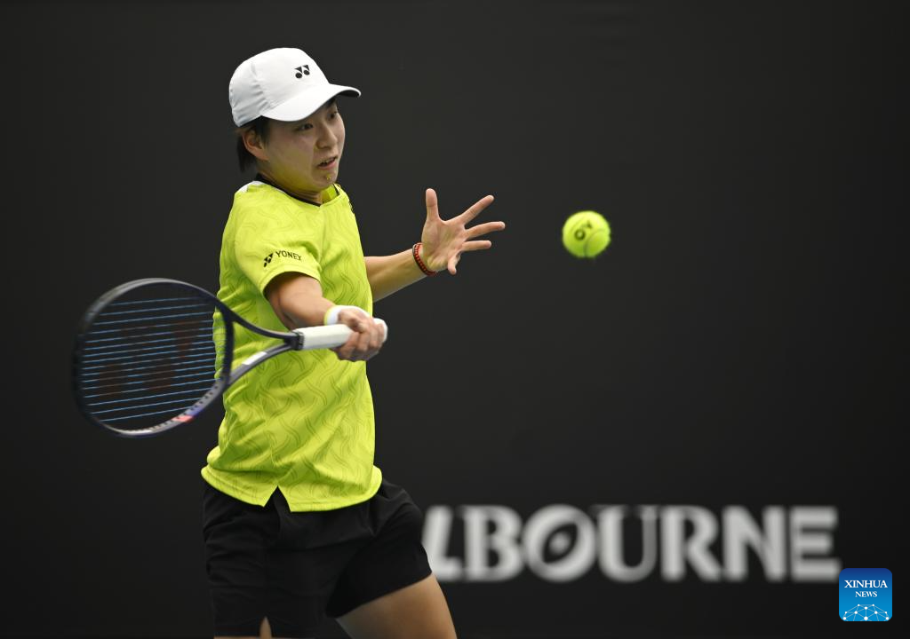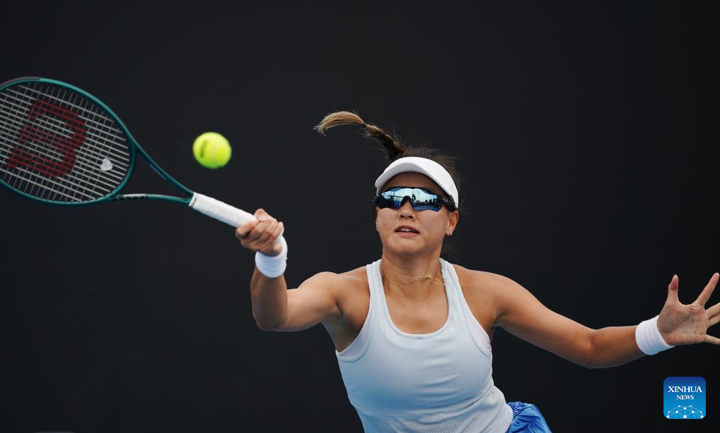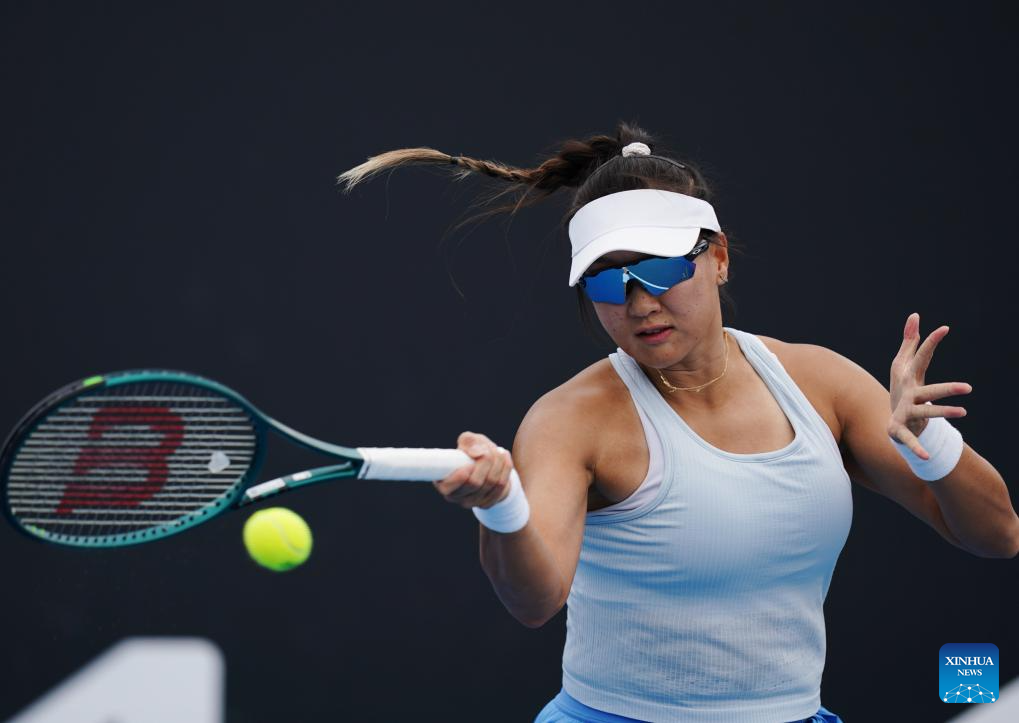 Bai Zhuoxuan of China hits a return during the women's singles qualifying 1st round match against Alina Korneeva of Russia at Australian Open tennis tournament in Melbourne, Australia, Jan. 13, 2026. (Photo by Wang Shen/Xinhua)