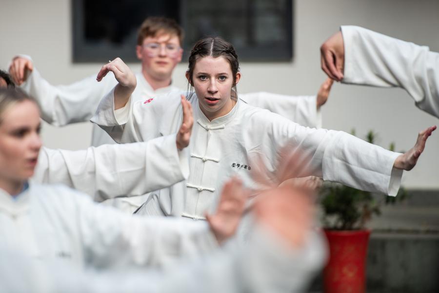 Members of a delegation of high school students from the U.S. state of Washington practice Tai Chi, one of the traditional cultural classics, on Wudang Mountain, a sanctuary for the Taoism martial art, in central China's Hubei Province, March 22, 2024. (Xinhua/Wu Zhizun)