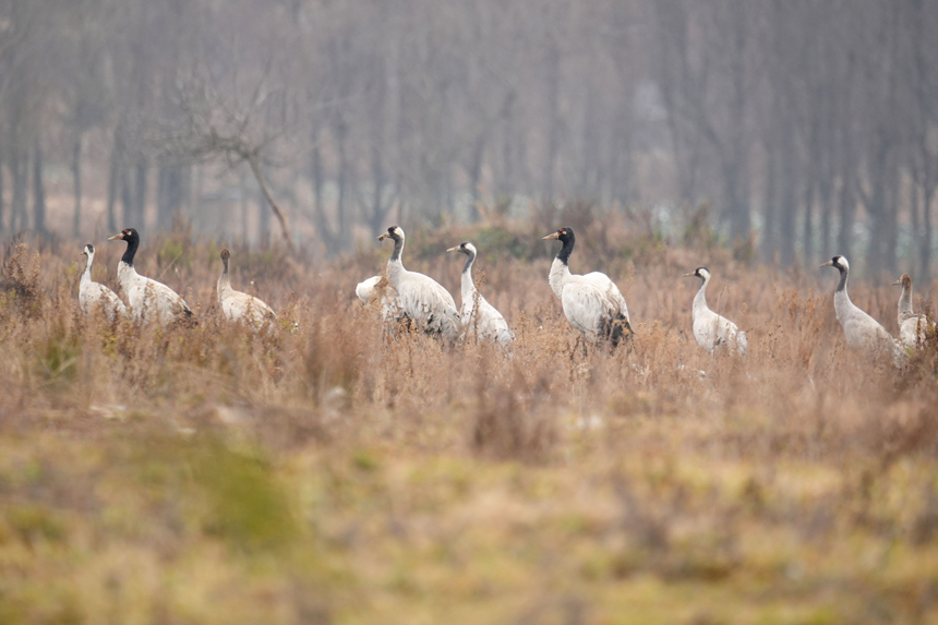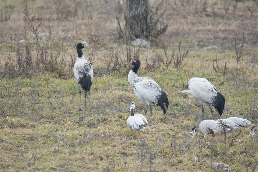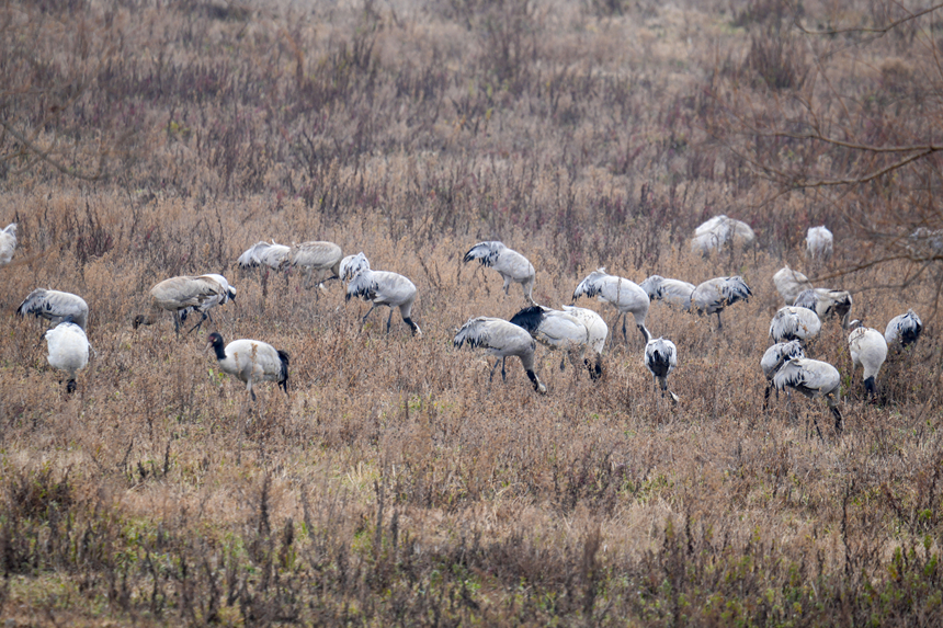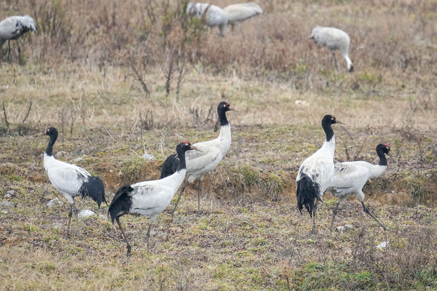 Black-necked cranes forage at Caohai National Nature Reserve in Yi-Hui-Miao Autonomous County of Weining, southwest China's Guizhou Province. (Photo courtesy of the media convergence center of Yi-Hui-Miao Autonomous County of Weining)
