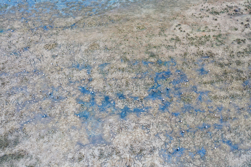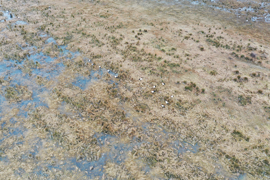 Aerial photo shows black-necked cranes at Caohai National Nature Reserve in Yi-Hui-Miao Autonomous County of Weining, southwest China's Guizhou Province. (Photo courtesy of the media convergence center of Yi-Hui-Miao Autonomous County of Weining)