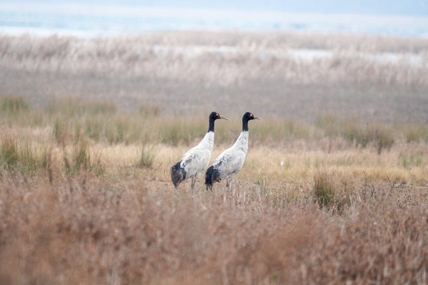 Photo shows two black-necked cranes at Caohai National Nature Reserve in Yi-Hui-Miao Autonomous County of Weining, southwest China's Guizhou Province. (Photo courtesy of the media convergence center of Yi-Hui-Miao Autonomous County of Weining)