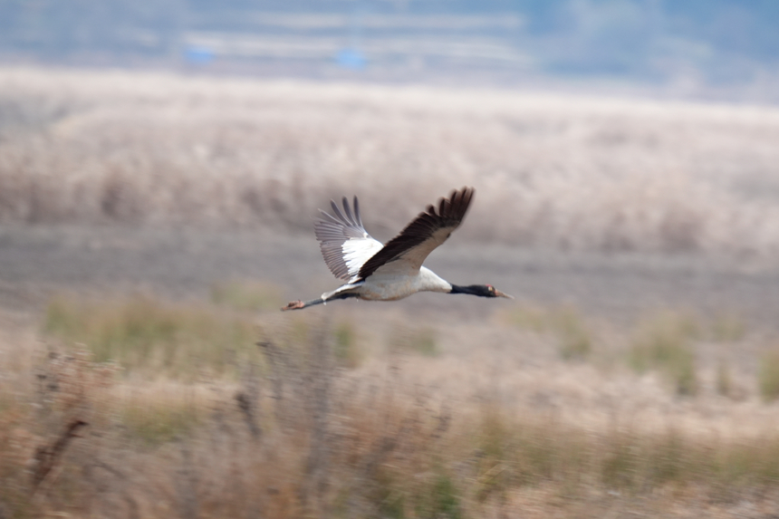 A black-necked crane flies over Caohai National Nature Reserve in Yi-Hui-Miao Autonomous County of Weining, southwest China's Guizhou Province. (Photo courtesy of the media convergence center of Yi-Hui-Miao Autonomous County of Weining)