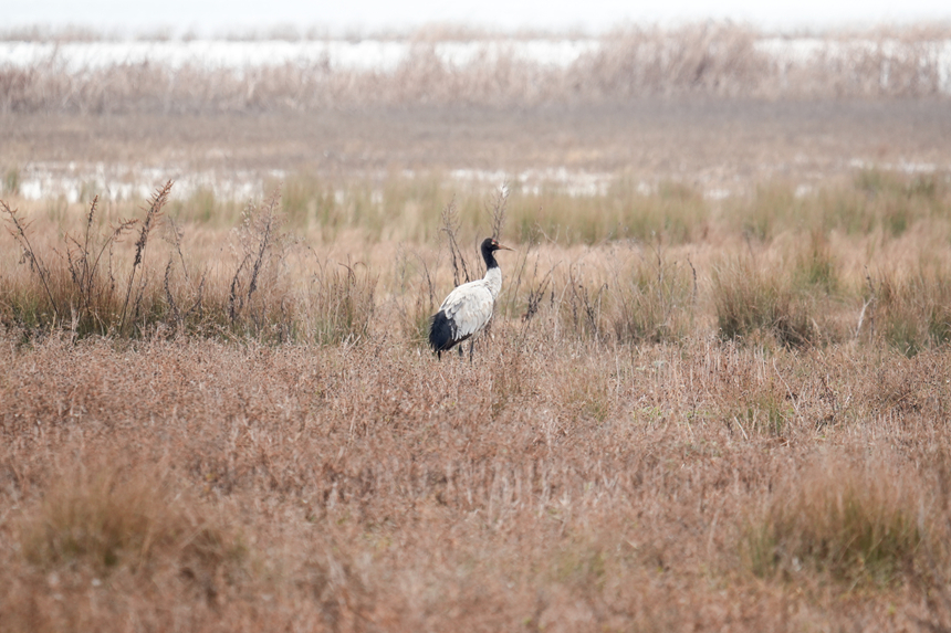 Photo taken on Jan. 8, 2026, shows a black-necked crane at Caohai National Nature Reserve in Yi-Hui-Miao Autonomous County of Weining, southwest China's Guizhou Province. (Photo/Chen Xiao)