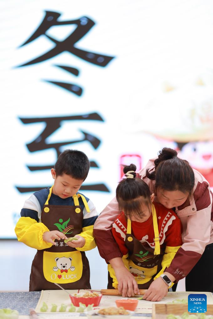 This photo taken on Dec. 21, 2025 shows community volunteers and elders making dumplings at an elder apartment on Winter Solstice in Shijiazhuang City, north China's Hebei Province.