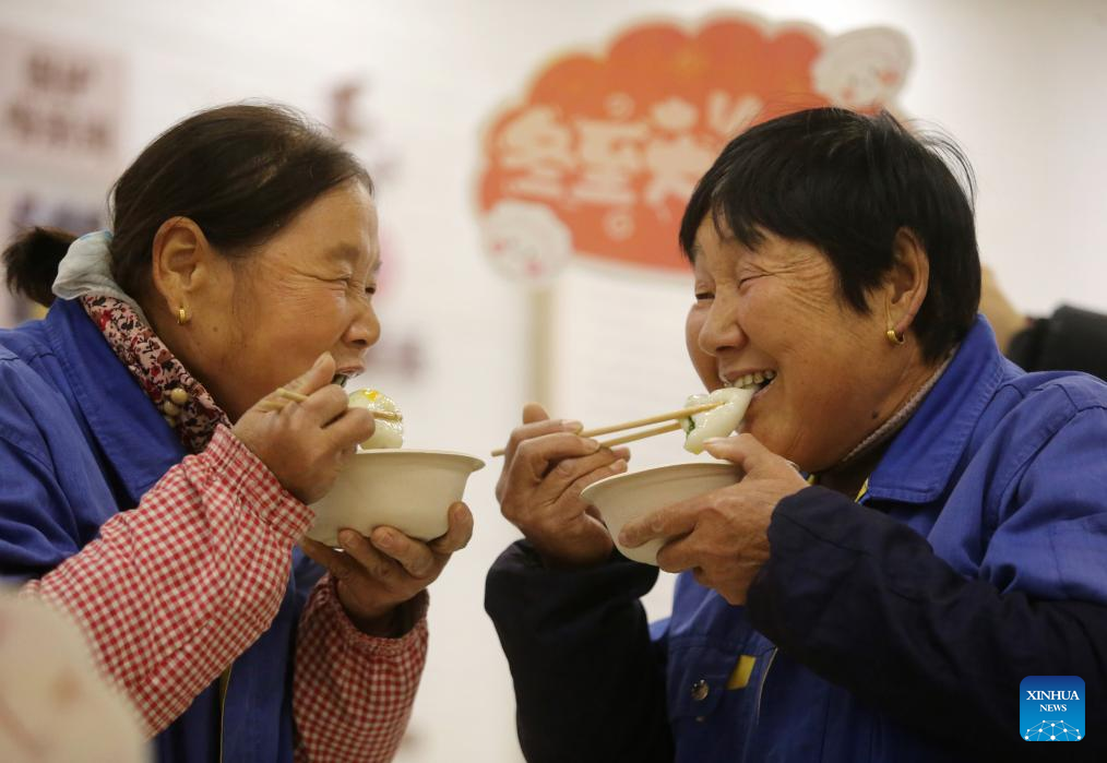 This photo taken on Dec. 21, 2025 shows sanitation workers eating rice dumplings during a welfare event on Winter Solstice in Yangzhou City, east China's Jiangsu Province.