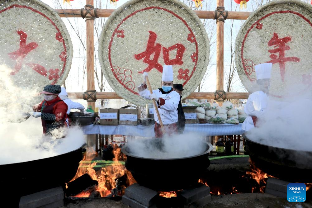 This photo taken on Dec. 21, 2025 shows chefs cooking special food on Winter Solstice in Qidian Village, Zhangye City of northwest China's Gansu Province.