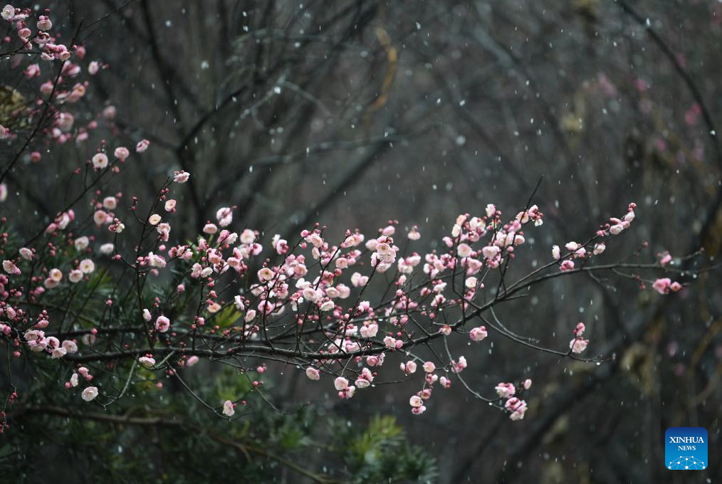 This photo taken on Jan. 1, 2026 shows plum flowers after a snowfall at a plum garden in Huashi Village, Jiyuan City of central China's Henan Province.