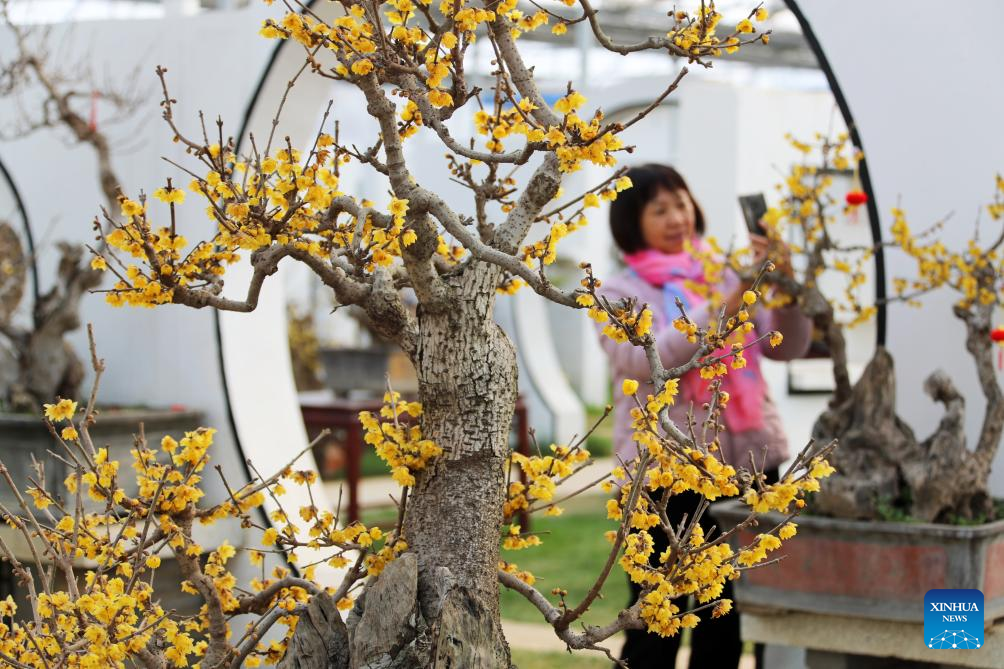 This photo taken on Jan. 1, 2026 shows a visitor taking photos of wintersweet at a garden in Yanling County, Xuchang City of central China's Henan Province.