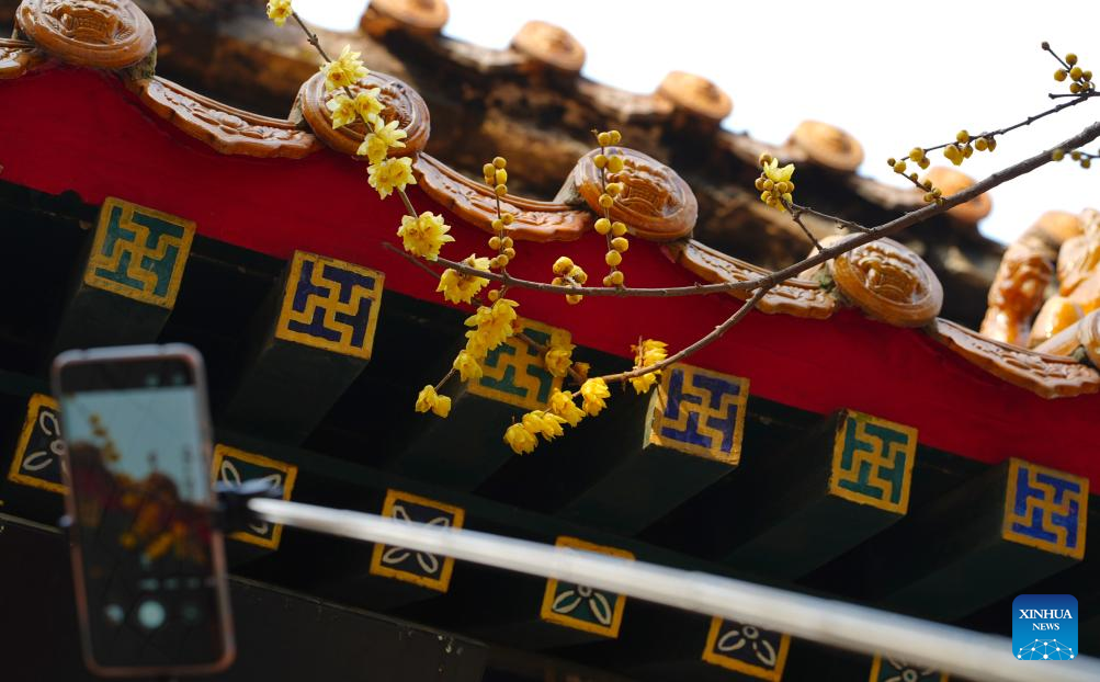 This photo taken on Jan. 5, 2026 shows a visitor taking photos of wintersweet at an ancient courtyard in Shijiazhuang City, north China's Hebei Province.