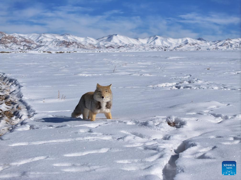 A drone photo taken on Dec. 31, 2025 shows a Tibetan fox walking on a snow-covered grassland in Kazak Autonomous County of Aksay, Jiuquan City of northwest China's Gansu Province.