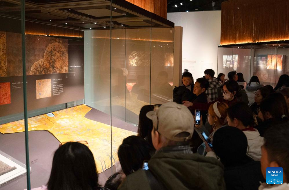 People visit the exhibition "Golden Thread: the Art of Dressing from North Africa to East Asia" at the Chengdu Museum in Chengdu, southwest China's Sichuan Province, Jan. 13, 2026. The exhibition features over 200 pieces (sets) of gold-threaded textile artifacts from seven French cultural institutions, alongside precious collections from eight Chinese museums and cultural heritage organizations. (Xinhua/Xu Bingjie)
