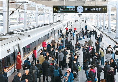 The inaugural train running between Beijing's Tongzhou district and Tangshan in north China's Hebei Province arrives at Tangshan Railway Station. With the recent opening of Beijing Tongzhou Railway Station, a one-hour commuter belt around Beijing has gradually taken shape. (Photo/Sun Lijun)