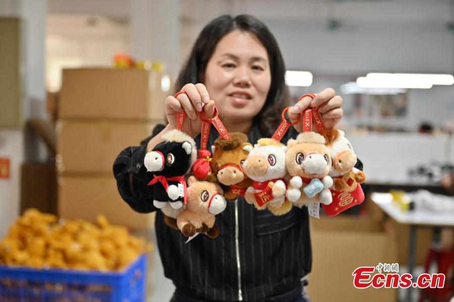 A worker displays Year of the Horse plush toys at a factory in Chashan Town, Dongguan, south China's Guangdong Province, Jan. 14, 2026. (Photo: China News Service/Chen Chuhong)