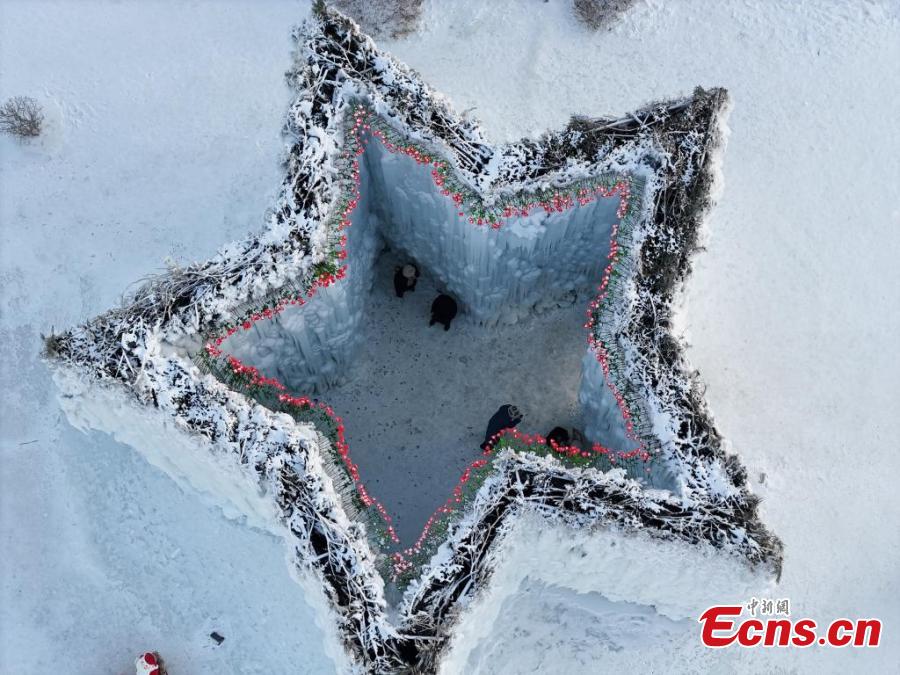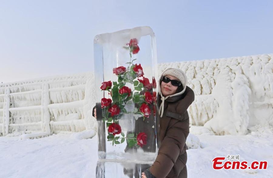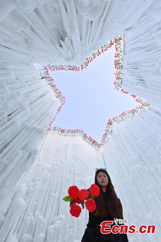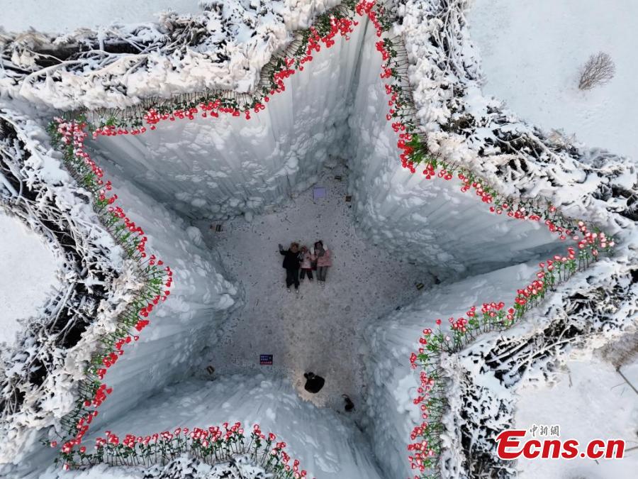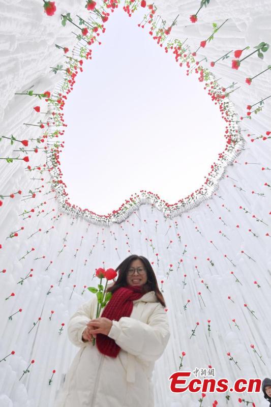 Visitors view a rose-themed ice installation at Yunlang Ice and Snow Park in Changchun, northeast China's Jilin Province, Jan. 13, 2026. (Photo: China News Service/Zhang Yao)