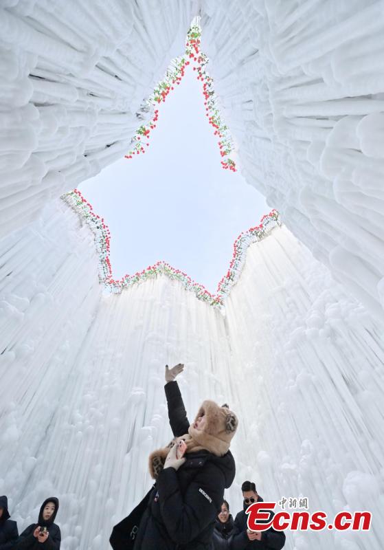 Visitors view a rose-themed ice installation at Yunlang Ice and Snow Park in Changchun, northeast China's Jilin Province, Jan. 13, 2026. (Photo: China News Service/Wang Changsheng)