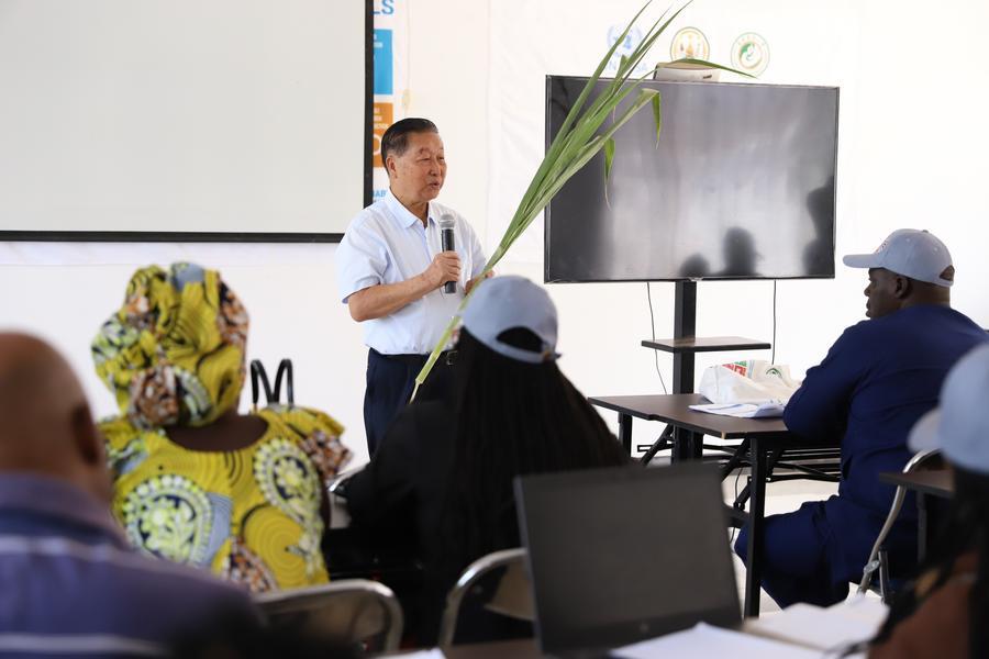 Lin Zhanxi lectures Juncao technology to participants of a training class at the China-Rwanda Agriculture Technology Demonstration Center in Huye District, Southern Province, Rwanda, on Aug. 4, 2024. (Photo by Huang Wanqing/Xinhua)
