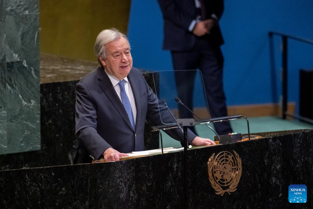 UN Secretary-General Antonio Guterres addresses the UN General Assembly on priorities for 2026 at the UN headquarters in New York, Jan. 15, 2026. Guterres emphasized three principles that guide the world body's work in 2026: adherence to the UN Charter, peace with justice -- peace between nations and peace with nature, and unity in an age of division. (Manuel Elas/UN Photo/Handout via Xinhua)