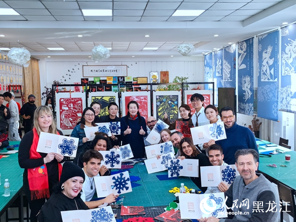 European media professionals and influencers experience paper cutting at Heilongjiang Vocational College of Art in Harbin, northeast China's Heilongjiang Province. (People's Daily Online/Shang Cheng)