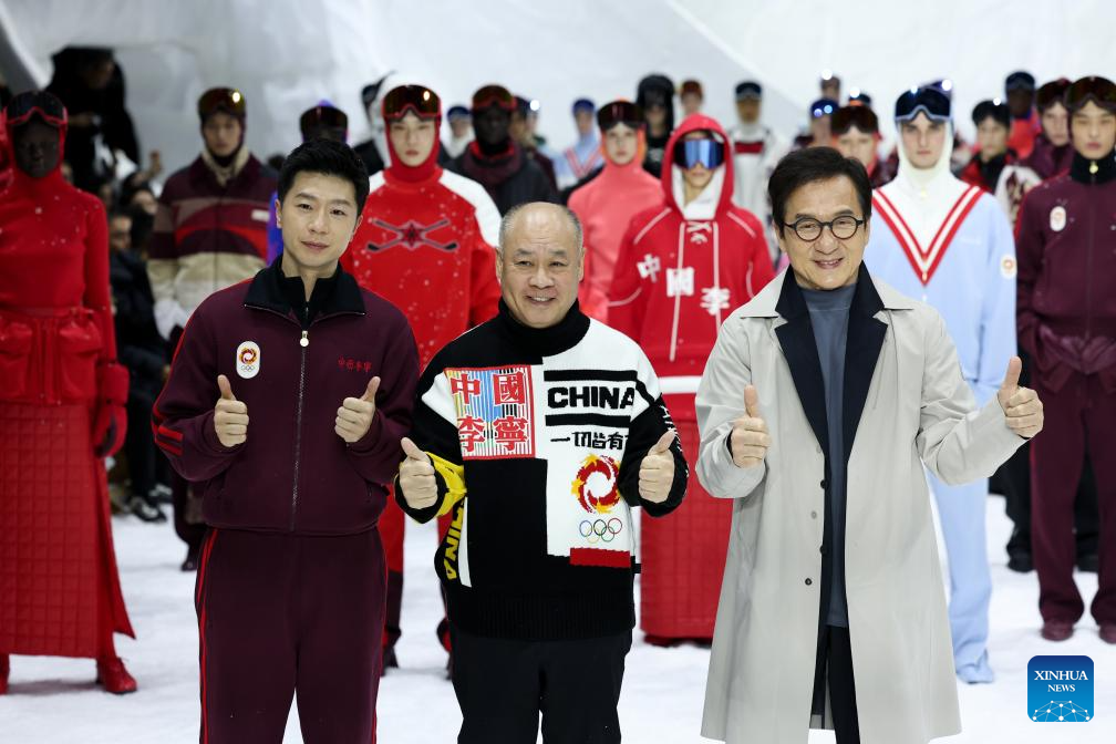 Chinese table tennis player and Olympic champion Ma Long, founder of the Li-Ning China brand Li Ning and actor Jackie Chan (from L to R) attend the fashion show of Fall/Winter 2026 collections of Li-Ning China during the Milan Men's Fashion Week in Milan, Italy, Jan. 16, 2026. (Xinhua/Li Jing)