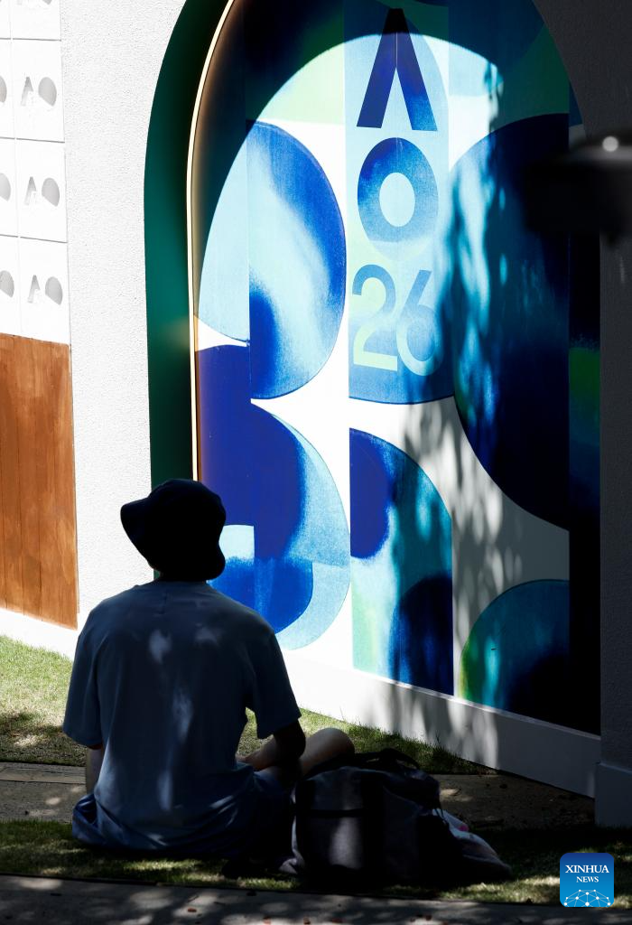 A man rests at Melbourne Park in Melbourne, Australia, Jan. 17, 2026. The main draw of the Australian Open tennis tournament 2026 runs at Melbourne Park in Melbourne, Australia, from Jan. 18 to Feb. 1, 2026. (Xinhua/Ma Ping)