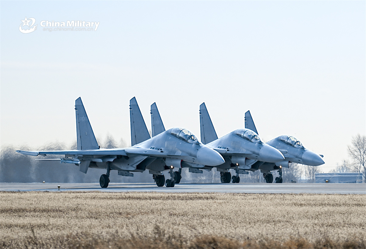 J-16 multi-role fighter jets attached to an aviation brigade under the Chinese PLA Air Force get ready for takeoff during a flight training exercise on January 5, 2026. (eng.chinamil.com.cn/Photo by Guo Shiteng)