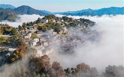 Mist shrouds Baibei village, Xinghua township, Rongjiang county, southwest China's Guizhou Province. (Photo/Pan Shaoping)