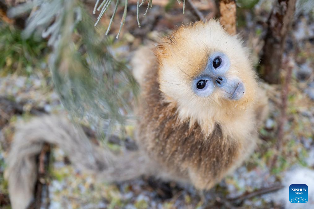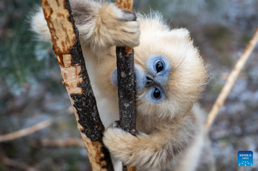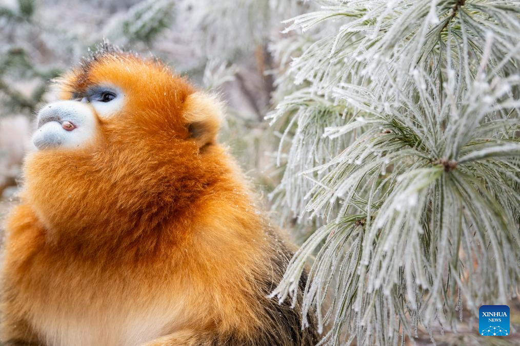 This photo taken on Jan. 19, 2026 shows a golden snub-nosed monkey at the Dalongtan Golden Monkey Research Center in Shennongjia National Park under the Shennongjia Forestry District, central China's Hubei Province. The district is now home to 11 populations of golden snub-nosed monkeys, totaling 1,618 individuals, with a habitat area of 401 square kilometers. (Xinhua/Du Zixuan)