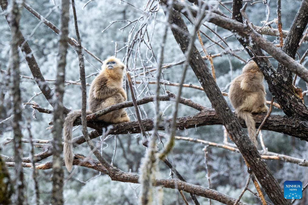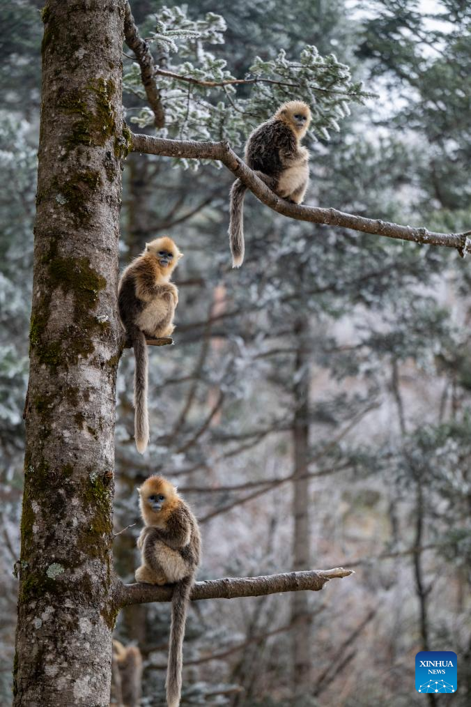 This photo taken on Jan. 19, 2026 shows golden snub-nosed monkeys at the Dalongtan Golden Monkey Research Center in Shennongjia National Park under the Shennongjia Forestry District, central China's Hubei Province. The district is now home to 11 populations of golden snub-nosed monkeys, totaling 1,618 individuals, with a habitat area of 401 square kilometers. (Xinhua/Wu Zhizun)